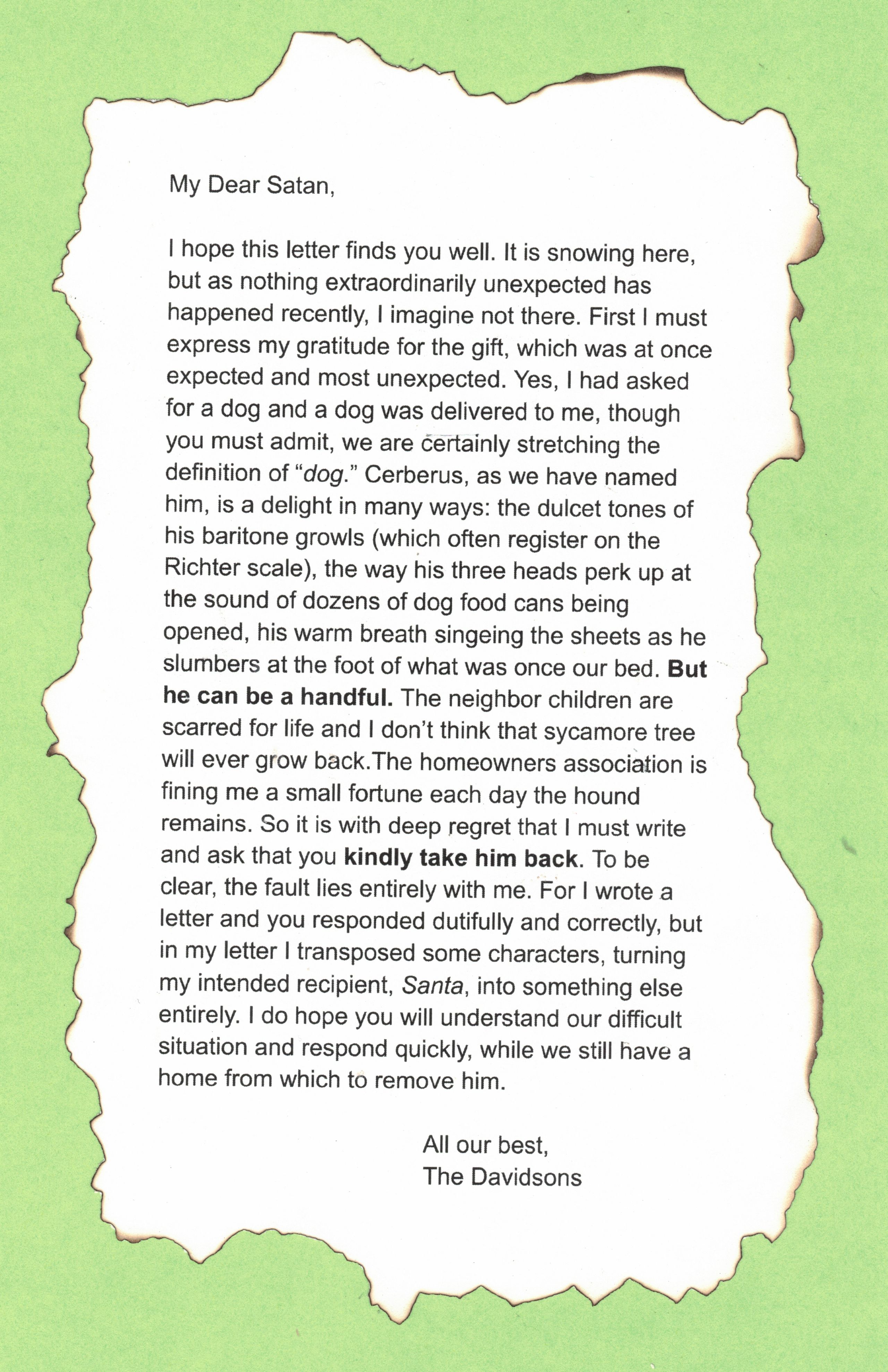 I hope this letter finds you well. It is snowing here, but as nothing extraordinarily unexpected has happened recently, I imagine not there. First I must express my gratitude for the gift, which was at once expected and most unexpected. Yes, I had asked for a dog and a dog was delivered to me, though you must admit, we are certainly stretching the definition of “dog.” Cerberus, as we have named him, is a delight in many ways: the dulcet tones of his baritone growls (which often register on the Richter scale), the way his three heads perk up at the sound of dozens of dog food cans being opened, his warm breath singeing the sheets as he slumbers at the foot of what was once our bed. But he can be a handful. The neighbor children are scarred for life and I don’t think that sycamore tree will ever grow back.The homeowners association is fining me a small fortune each day the hound remains. So it is with deep regret that I must write and ask that you kindly take him back. To be clear, the fault lies entirely with me. For I wrote a letter and you responded dutifully and correctly, but in my letter I transposed some characters, turning my intended recipient, Santa, into something else entirely. I do hope you will understand our difficult situation and respond quickly, while we still have a home from which to remove him.