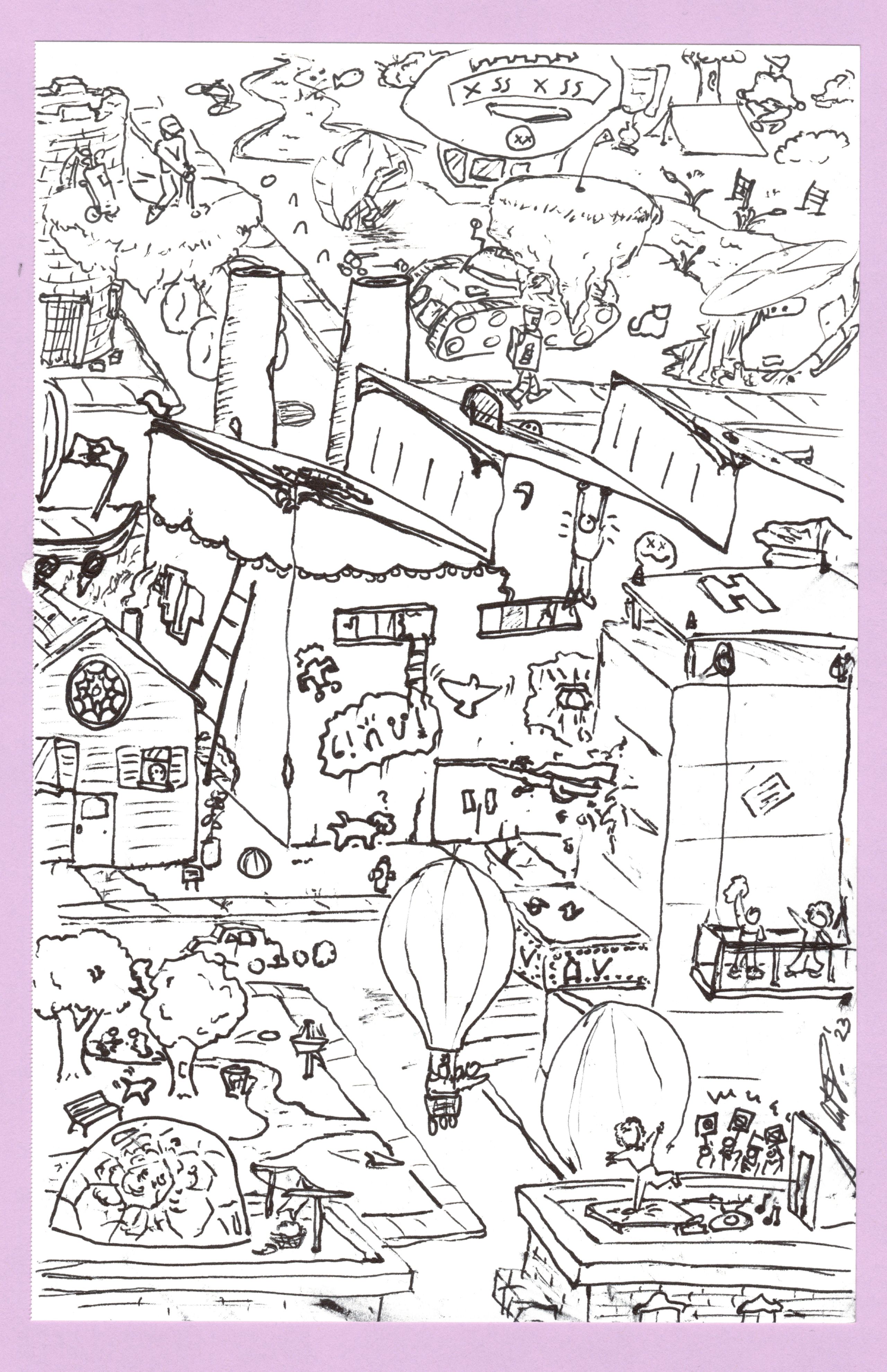 A sketch of a scene of busy city block, dense with random activities and characters.