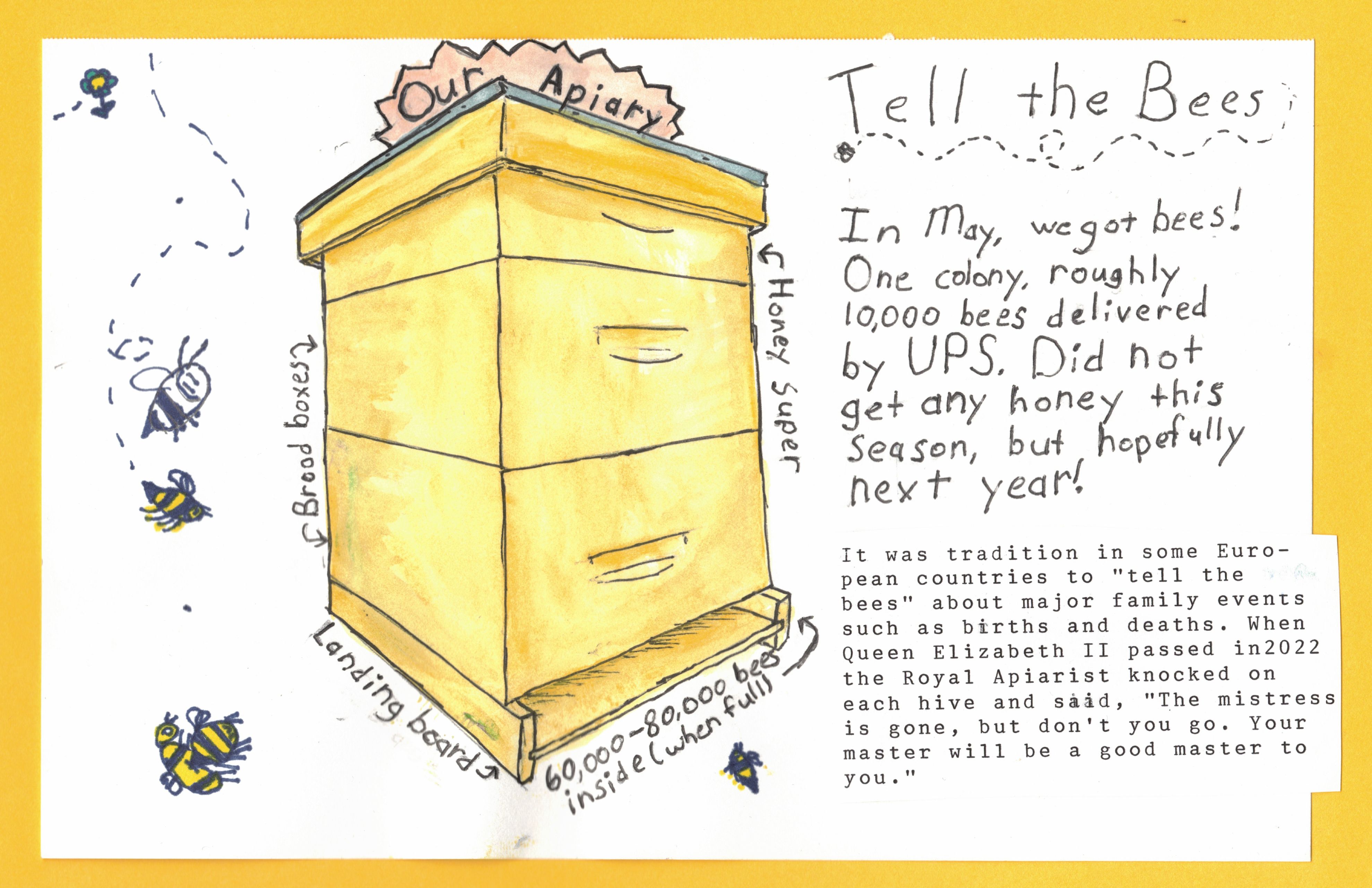 In May, we got bees! One colony, roughly 10,000 bees delivered by UPS. Did not get any honey this season, but hopefully next year!